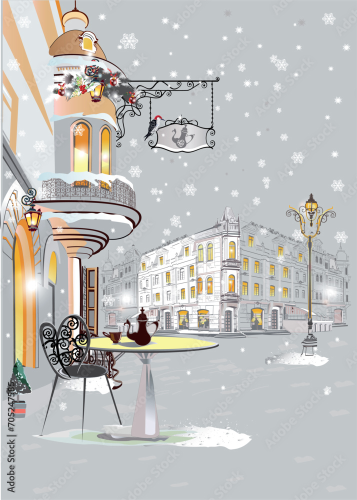 Fotografie Hand drawn colorful vector Illustration of the romantic street in winter