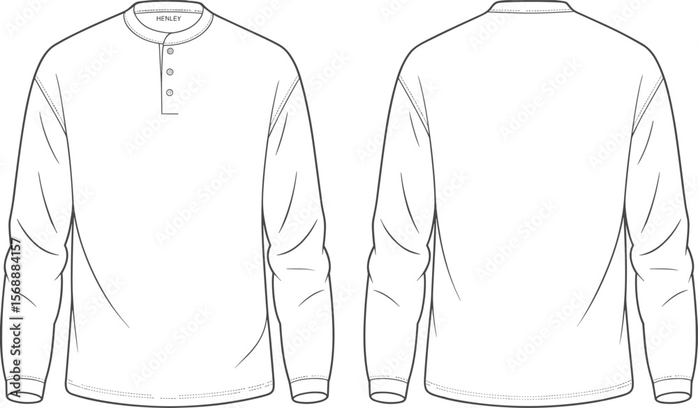 Naklejka Men’s henley shirt fashion flat sketch, long sleeve top front and back view, vec