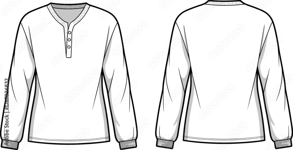 Naklejka Long sleeve henley shirt front and back view, apparel design, fashion flat templ