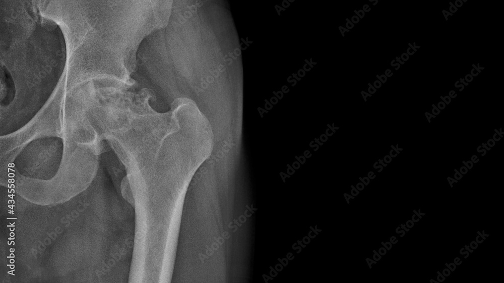 Obraz na płótnie X-ray of a painful hip in a man with osteoarthritis of the left hip joint in the red area, very painful, difficult to walk, worn out joint, endoprosthetics