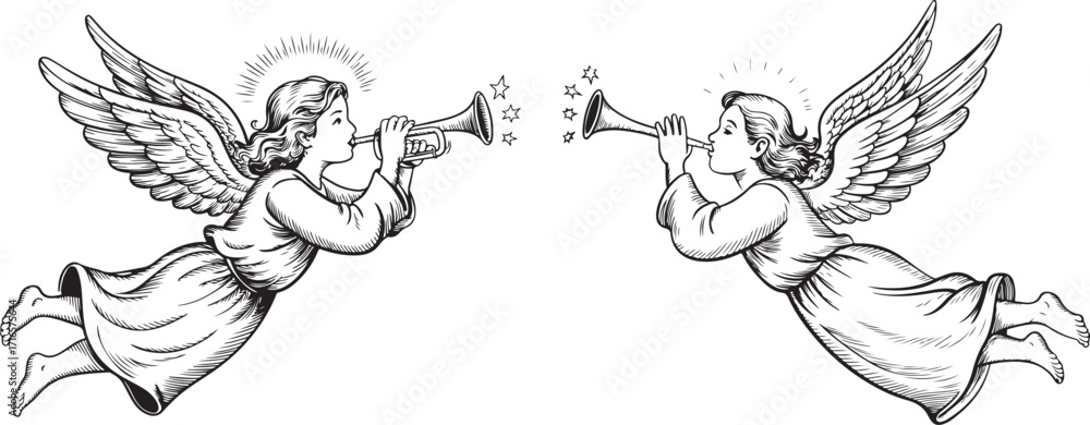 Fotografie Vintage engraving Flying Angels with Trumpets Illustration